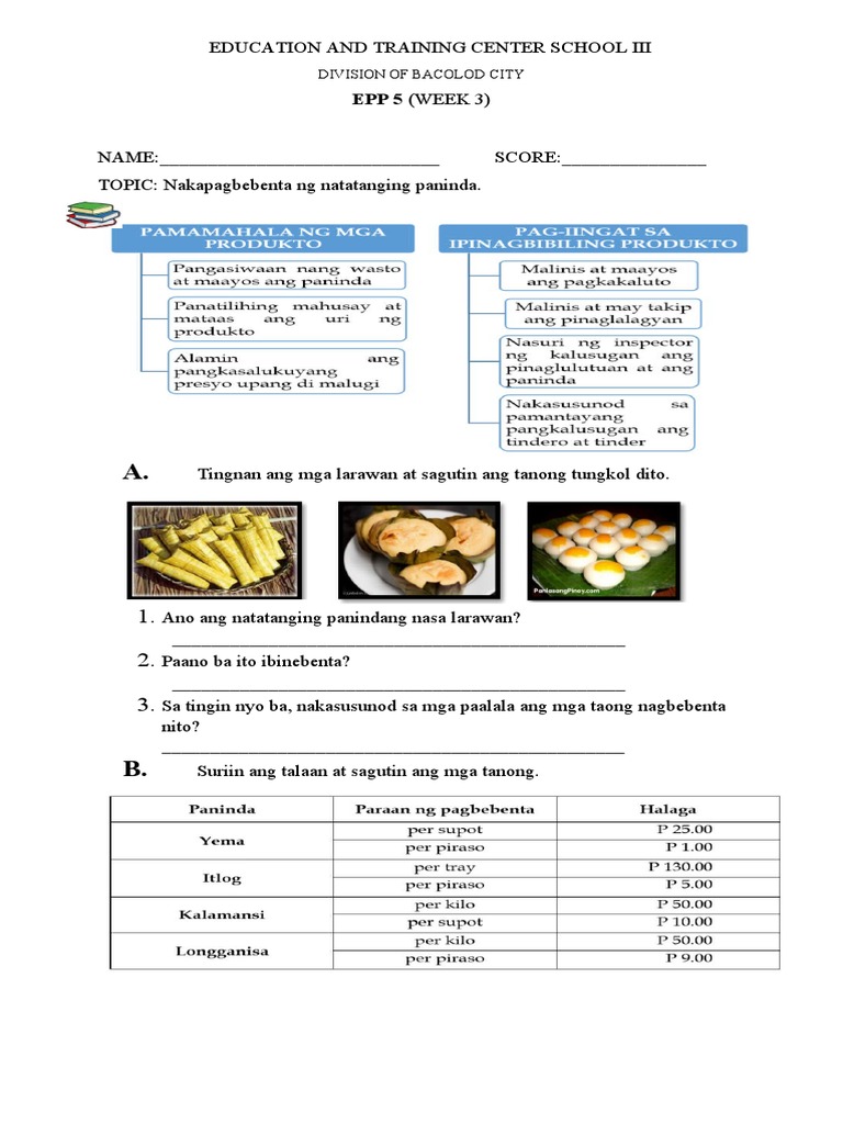 Hindi naluto o nainit na mabuti ang pagkain. 1572014 Lesson Plans in Edukasyong Pantahanan at Pangkabuhayan GRADE 4 Aralin 1 Kahalagahan ng Pag-eentreprenur 4 Aralin 2 Nakakatulong ang Bawat Kasapi ng Mag-anak sa Pagtitipid 8 Aralin 3 Pag-eentreprenur at Pakikipagsapalaran 12 Aralin 4 Mga Paraan Upang Makapagtipid 17 Aralin 5 Talaan ng Gastos at Kita 22 Aralin 6 Tingiang Tindahan at Pamumuhay ng Mag-anak 25 GRADE 5 Aralin 1 Pagtutuos ng. Inihalimbawa ni Tiongson ang pagtitipid sa pagkain.